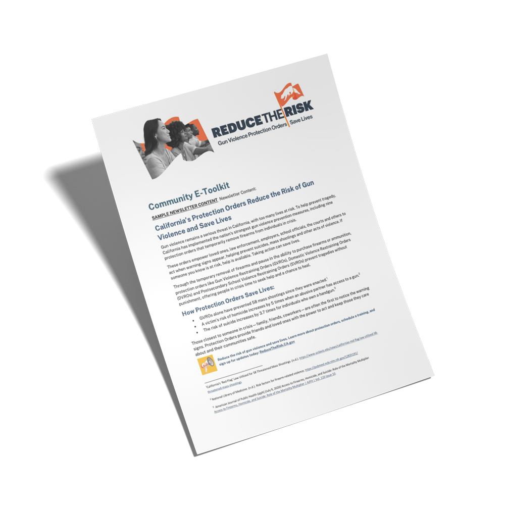 By sharing this information, we can help more people learn about California’s protection orders and how they can prevent gun violence. If even one person in your community uses a protection order to prevent harm, your support could help save a life.